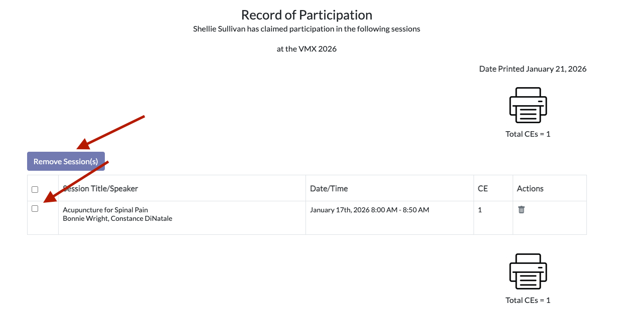 Open your Record of Participation and click on the session(s) you wish to remove. Click Remove Session(s) at the top.