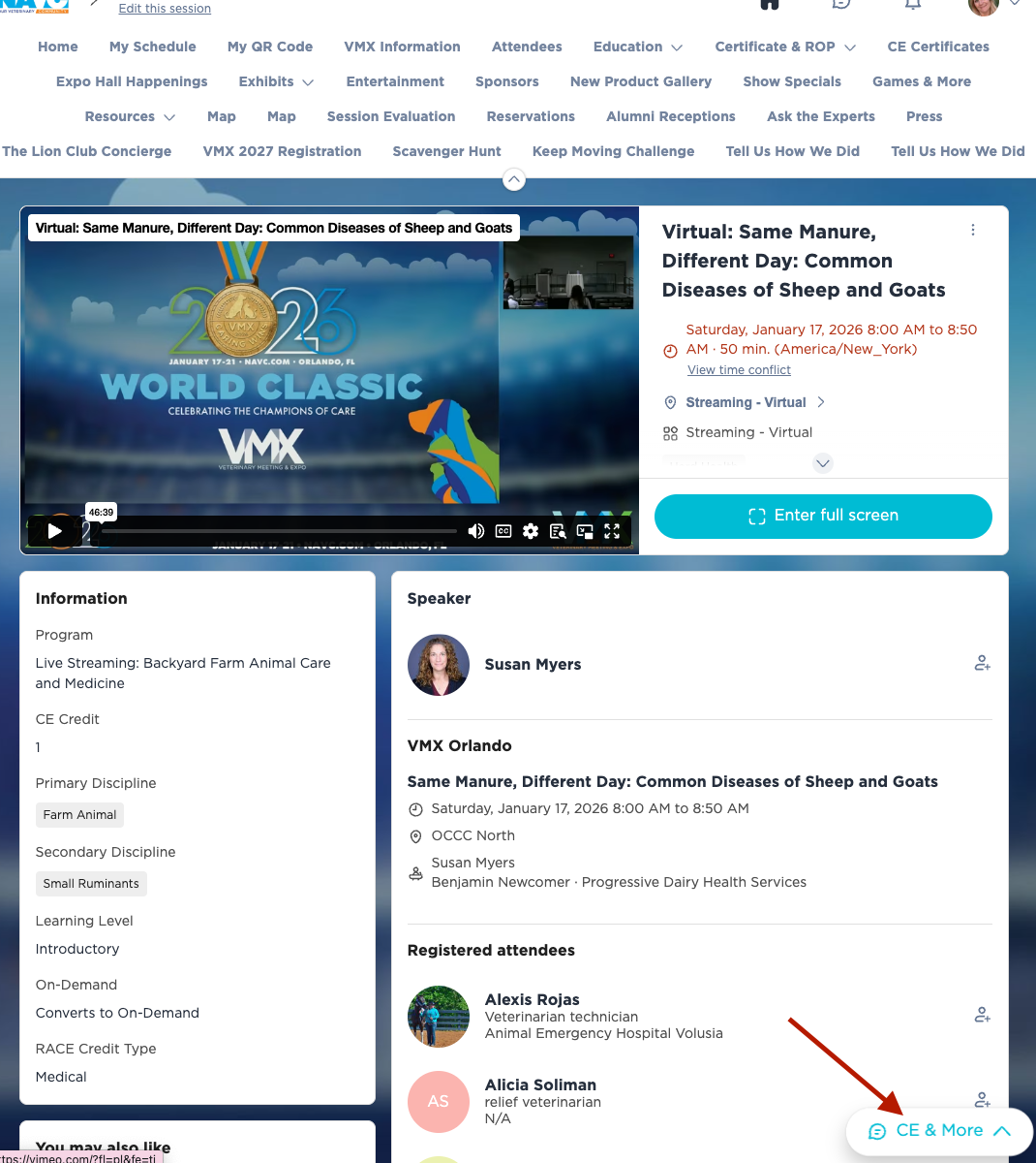 Under the Education tab, search for the missing session. On the bottom right, you will see CE & More.