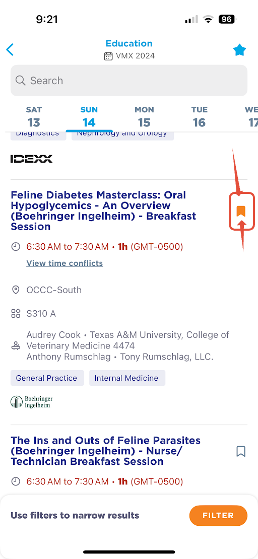 on the right of the session you wish to bookmark, click on the bookmark icon.